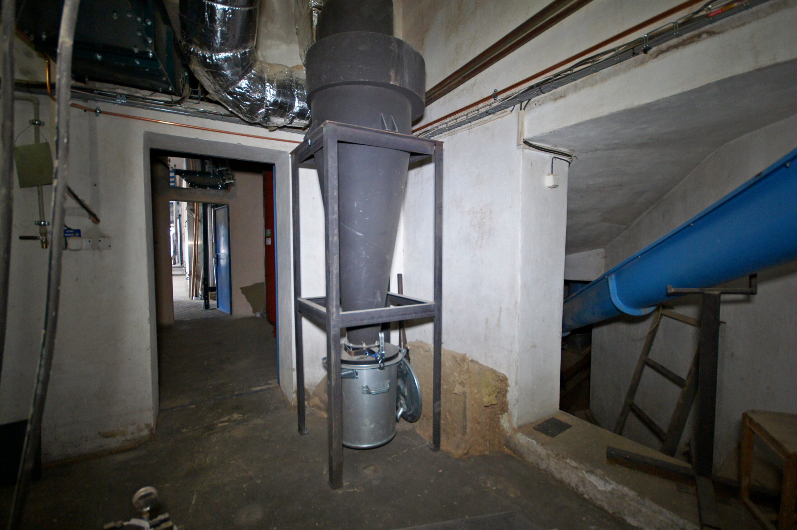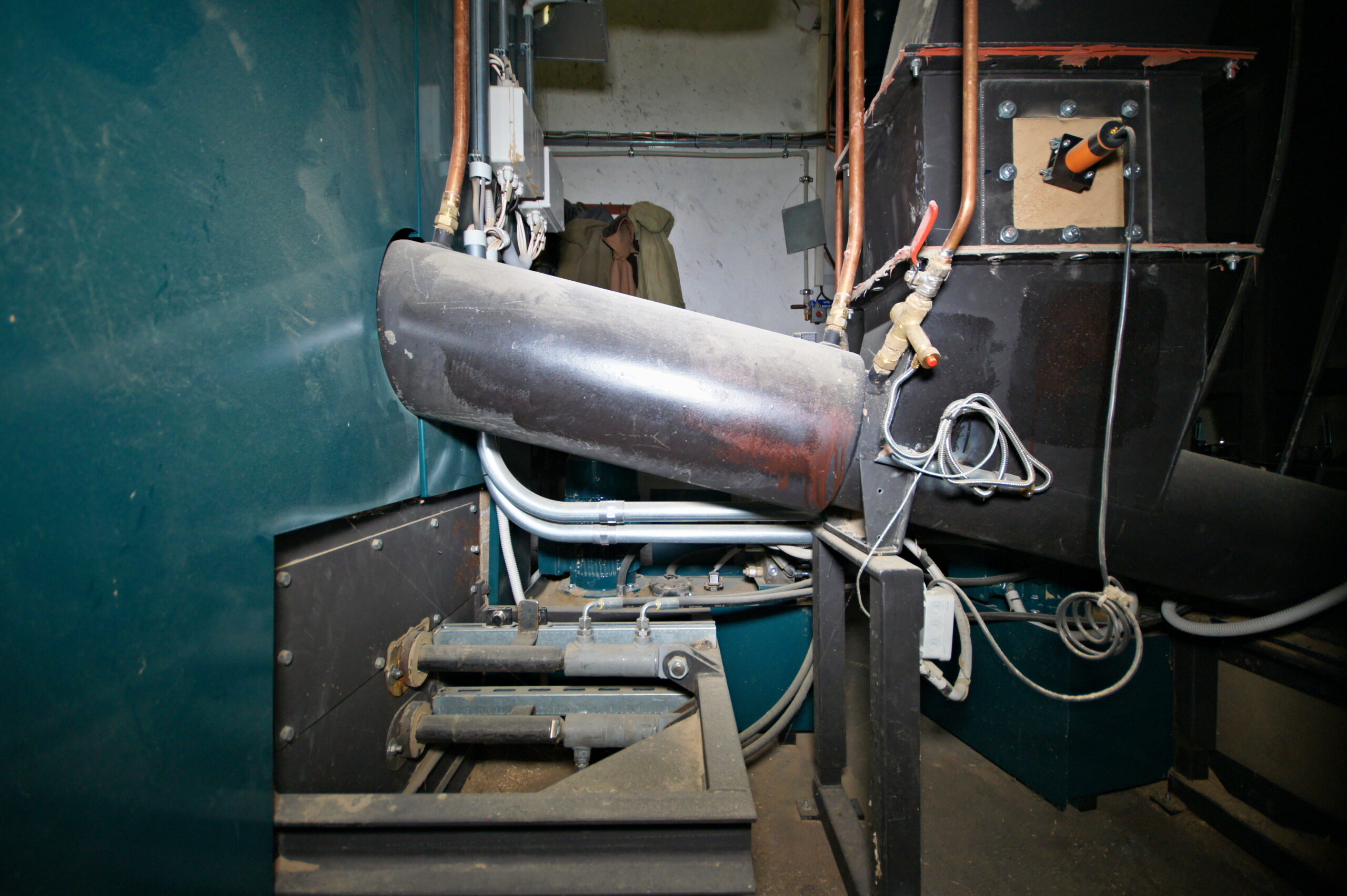Dalším požadavkem investora bylo napojení venkovní skládky materiálu na kotelnu. Toto jsme vyřešili pomocí redlerových dopravníků, které procházejí budovou, jsou ale umístěny u stropů na konstrukcích tak, aby byly prostory pod nimi průchozí. Materiál posléze putuje do násypky odkud je hydraulickým plněním dopravován do prostoru topeniště, kde dochází k jeho spalování.